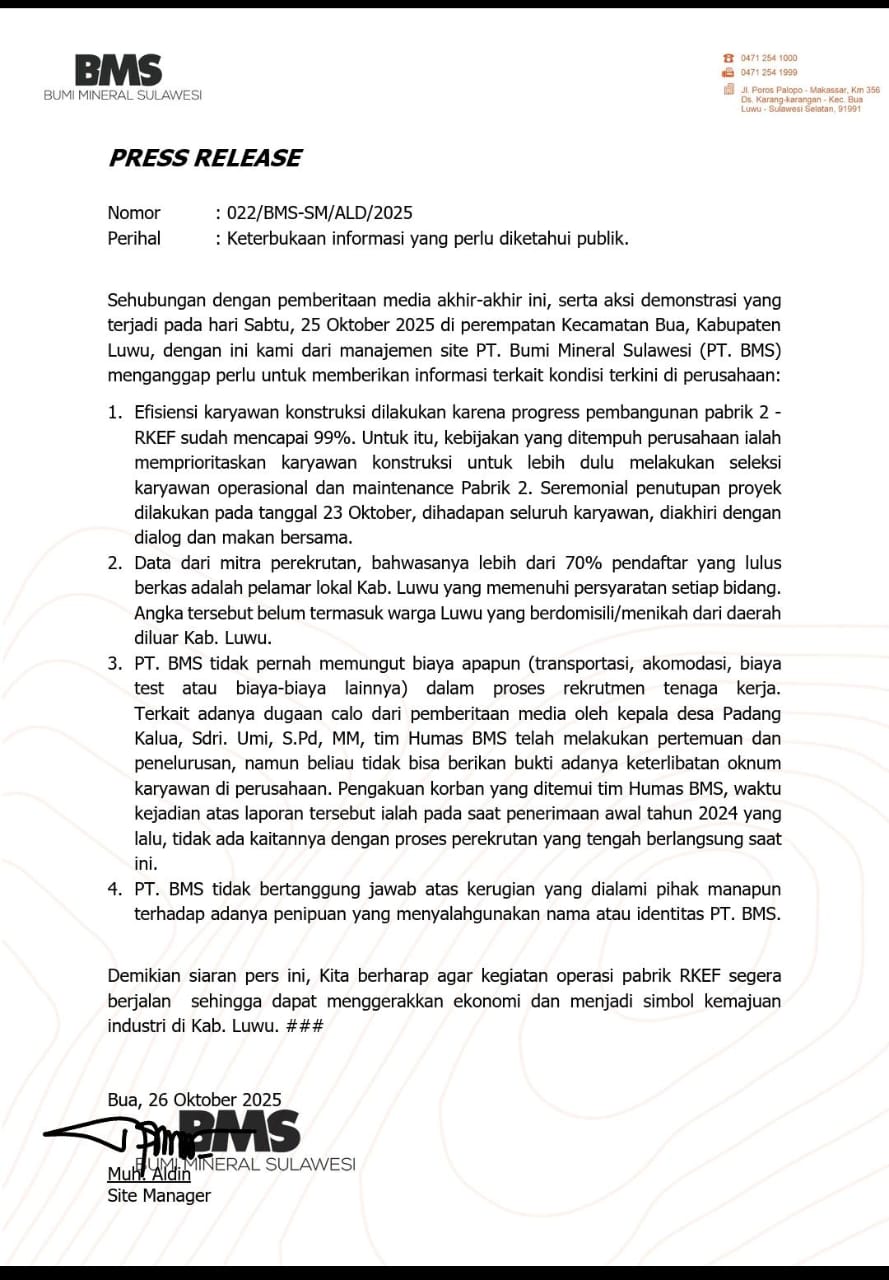 LUWU | POROSTENGAH.COM – Menyikapi pemberitaan media dan aksi demonstrasi yang terjadi pada Sabtu, 25 Oktober 2025 di perempatan Kecamatan Bua, Kabupaten Luwu, manajemen PT. Bumi Mineral Sulawesi (PT. BMS) menyampaikan klarifikasi serta informasi terkini mengenai kondisi perusahaan.