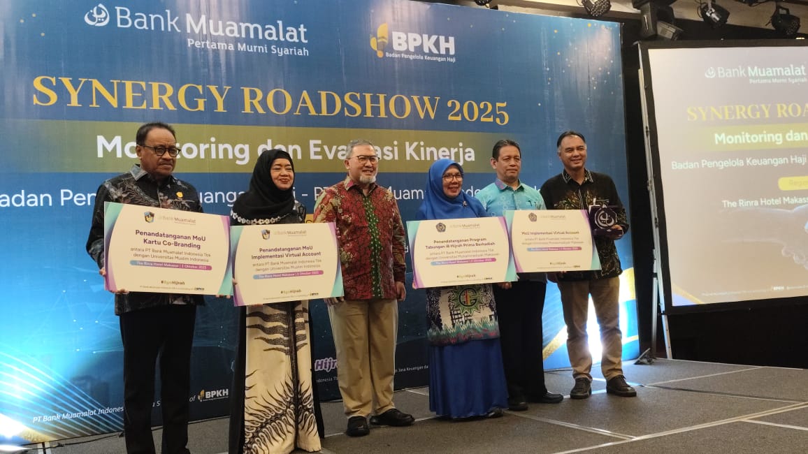 Dalam rangkaian Synergy Roadshow 2025 region Sulawesi, Maluku, dan Papua (Sulampua), di Makassar, Kamis (2/10/2025), Bank Muamalat memberi dukungan produk dan layanan perbankan syariah kepada Universitas Muhammadiyah (Unismuh) Makassar dan Yayasan Wakaf Universitas Muslim Indonesia (UMI). Kepada Unismuh Makassar, Bank Muamalat memfasilitasi layanan virtual account dan tabungan. Sementara bagi Yayasan Wakaf UMI, Bank Muamalat memfasilitasi layanan virtual account dan co-branding kartu ATM.