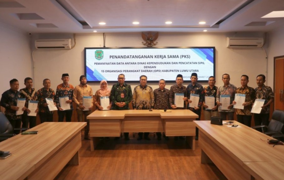 LUWU UTARA | POROSTENGAH.COM — Dinas Kependudukan dan Pencatatan Sipil (Disdukcapil) Kabupaten Luwu Utara menandatangani Perjanjian Kerja Sama (PKS) terkait Pemberian Hak Akses dan Pemanfaatan Data Kependudukan dengan 15 Perangkat Daerah (PD) di lingkungan Pemerintah Kabupaten Luwu Utara.