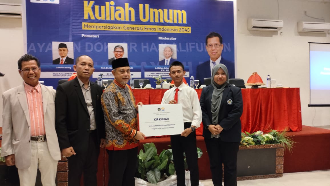 Penyerahan bantuan KIP tersebut diberikan disela-sela Kuliah Umum dengan tema ” Mempersiapkan Generasi Emas 2045″ yang dihadiri oleh jajaran pimpinan universitas, dosen, serta perwakilan mahasiswa penerima bantuan di hotel Grand Imawan Makassar.