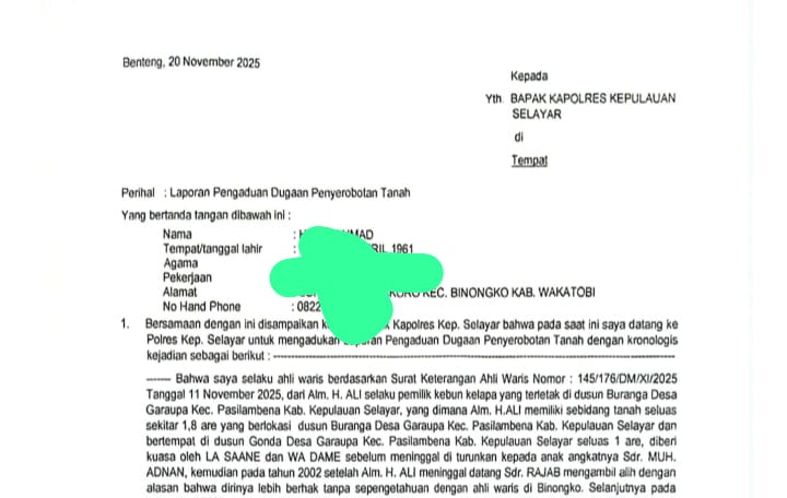 SELAYAR | POROSTENGAH.COM – Dugaan penyerobotan lahan kebun kelapa kembali mencuat di Kecamatan Pasilambena, Kabupaten Kepulauan Selayar. Seorang warga Pasilambena, Husni Ahmad, resmi mengadukan persoalan itu ke Polres Kepulauan Selayar, Kamis (20/11/2025).