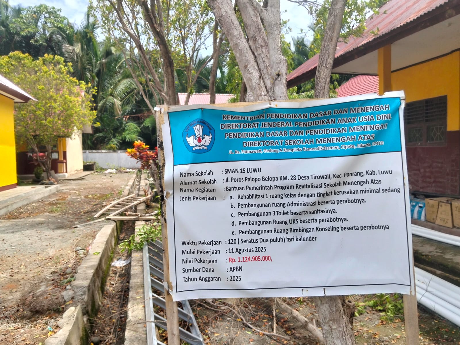 Diketahui, pemerintah melalui Kementerian Pendidikan Dasar dan Menengah mengalokasikan anggaran sebesar Rp1.124.905.000 untuk program revitalisasi SMAN 15 Luwu Tahun Anggaran 2025. Program ini merupakan Bantuan Pemerintah Revitalisasi Sekolah Menengah Atas yang bersumber dari APBN 2025.