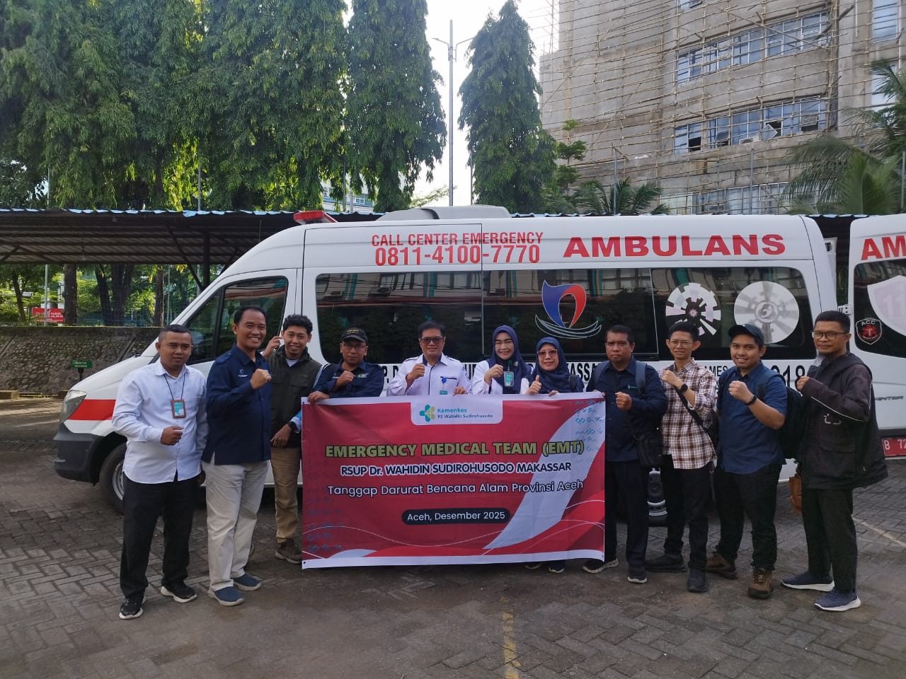 POROSTENGAH.COM, Makassar — Rumah Sakit Umum Pusat (RSUP) Dr. Wahidin Sudirohusodo Makassar memberangkatkan Emergency Medical Team (EMT) khusus untuk membantu masyarakat terdampak bencana alam di Provinsi Aceh, Kamis (04/12/2025).