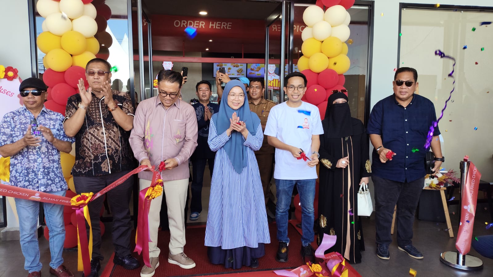 Prosesi seremonial ditandai dengan gunting pita yang dilakukan oleh Ibu Melinda Aksa – Ketua Tim Penggerak PKK Kota Makassar, Ir. H. Isrullah Achmad – Founder Alhajj Fried Chicken, Muh Ilhamsyah Eka Putra Andry Omar – CEO Alhajj Fried Chicken, Wakil Bupati Luwu Utara – H. Jumail Mapile S.IP., M.Si dan ketua BPW KKLR Sul Sel Keluarga kerukunan luwu Raya – Ir.Hasbi Syamsu Ali MMA.